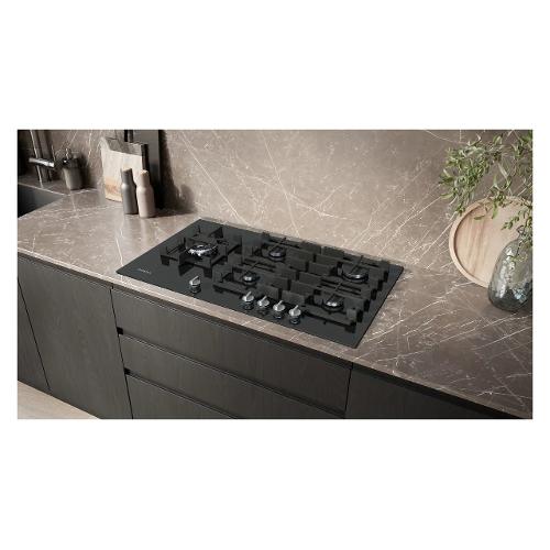 Piano cottura a gas in vetro temperato con tecnologia stepFlame per un controllo preciso della fiamma, manopole magnetiche removibili e griglie semi-continue per una facile pulizia.