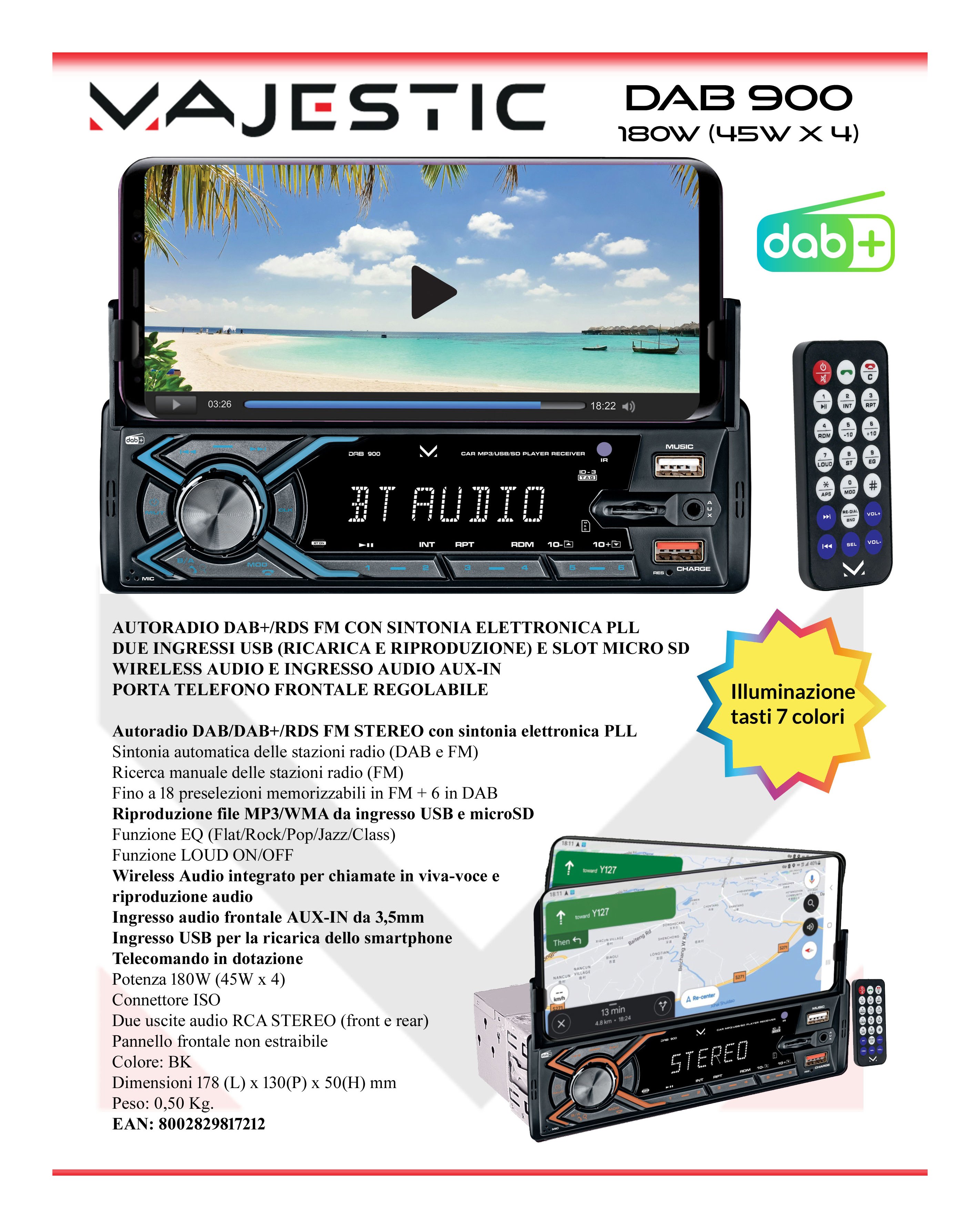 Scopri la nuova autoradio DAB 900 Majestic, la soluzione ideale per una guida connessa e futuristica. Il supporto frontale per smartphone ti permette di navigare in rete e utilizzare le app preferite, rendendo ogni viaggio un’esperienza unica.