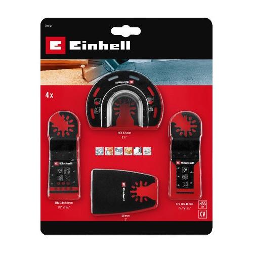 Il set multiutensile da 4 pezzi di einhell offre una pratica selezione di accessori multiutensile con un'ampia gamma di possibilità di utilizzo. Il set include una lama per sega a tuffo bimetallica con una larghezza di 34 mm e 18 denti per pollice (tpi), realizzati in acciaio rapido temprato ad alte prestazioni. Questo lo rende ideale per lavori di ristrutturazione e riparazione. Il set di accessori multiutensile include anche una lama per sega a tuffo bimetallica semicircolare da 87 mm di diametro con 18 tpi, i cui denti sono anch'essi realizzati in acciaio rapido ad alte prestazioni. La forma semicircolare e segmentata consente tagli precisi negli angoli e sui bordi senza sovratagli. Come la lama per sega a tuffo bim, presenta anche fori per una più rapida evacuazione dei trucioli, che consentono un'efficiente dissipazione del calore e quindi migliorano le prestazioni di taglio. Entrambe le lame per sega multiutensile bim sono ideali per il taglio di metalli non ferrosi, lamiere, legno con chiodi, cartongesso e plastica. Un altro componente del set è la lama per sega a tuffo in acciaio crv da 20 mm di larghezza, appositamente progettata per il taglio di legno duro e tenero, nonché di diverse materie plastiche. L'acciaio crv offre un'eccellente durezza e resistenza all'usura, che ne sottolineano la durevolezza. Il set multiutensile è completato da un raschietto flessibile largo 50 mm. Questo utensile multiutensile è ideale per rimuovere residui di colla e residui di silicone. Tutte le lame del set sono dotate di funzione di cambio rapido grazie all'attacco posteriore aperto, compatibile con tutti i multiutensili disponibili in commercio. Ciò semplifica la sostituzione rapida degli utensili multiutensile durante il lavoro e aumenta la produttività. Grazie alla loro selezione ben studiata, gli accessori per multiutensili einhell offrono una base eccellente per un'ampia gamma di progetti.