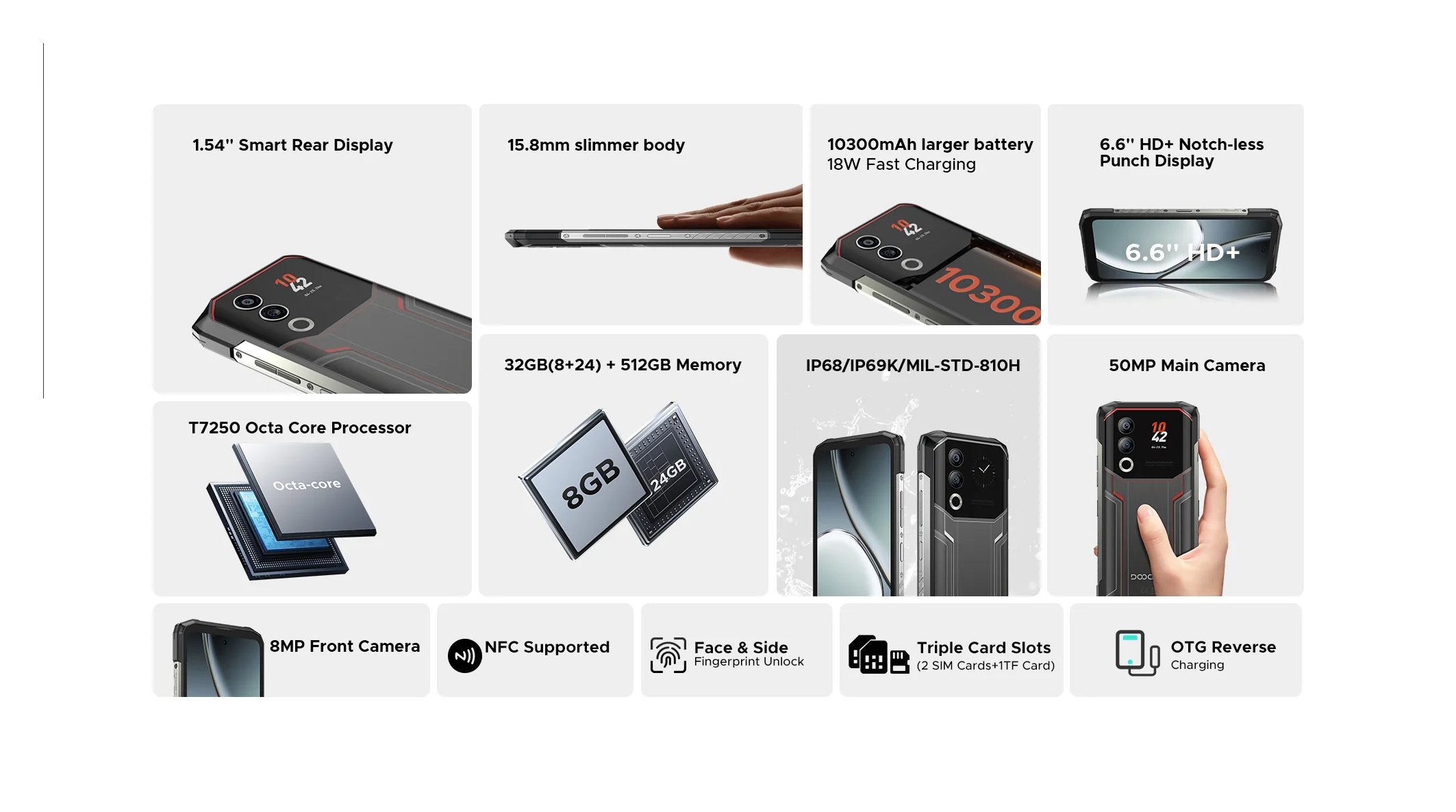 Lo smartphone ultra-resistente Doogee Blade20 Ultra offre tutto ciò che stai cercando: prestazioni potenti, ampia capacità di archiviazione, fotocamere di alta qualità e un design robusto ma elegante. Questo telefono robusto è perfetto per chi desidera affidabilità e velocità senza rinunciare allo stile.