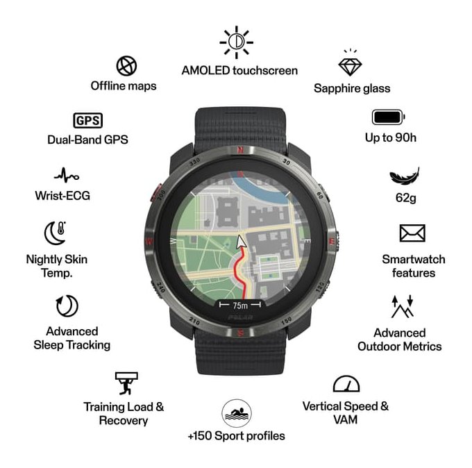 Polar Grit X2 è un outdoor watch compatto e resistente, pensato per le grandi avventure e la performance quotidiana. Dotato di funzioni di allenamento avanzate, un display AMOLED in vetro zaffiro e una navigazione ad alta precisione con mappe a colori, è progettato per accompagnarti sui sentieri e nella vita di tutti i giorni.