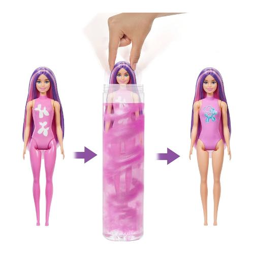 Con 6 sorprese in ogni confezione, con le bambole Barbie Color Reveal il divertimento è assicurato: bambini adoreranno scoprire la serie con animali a forma di palloncini con l'innovativa e originale funzione Color Reveal! Inizia questa esperienza rimuovendo lo strato esterno della confezione, poi svita la parte superiore del tubo ed estrai la bambola Barbie: il suo look è nascosto da un rivestimento rosa scintillante Color Reveal e da sacchettini dal contenuto misterioso! Riempi il tubo con acqua calda, posiziona la bambola all'interno, falla ruotare e toglila per rivelare il suo look. Quale bambola troverai? Apri le borse per scoprire gli accessori alla moda: una gonna con una colorata stampa di palloncini a forma di animale, un cerchietto per capelli, scarpe con plateau di tendenza e un variopinto palloncino a forma di animale! Usa l'acqua fredda e calda per trasformare il corpetto della bambola tutte le volte che vuoi!