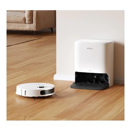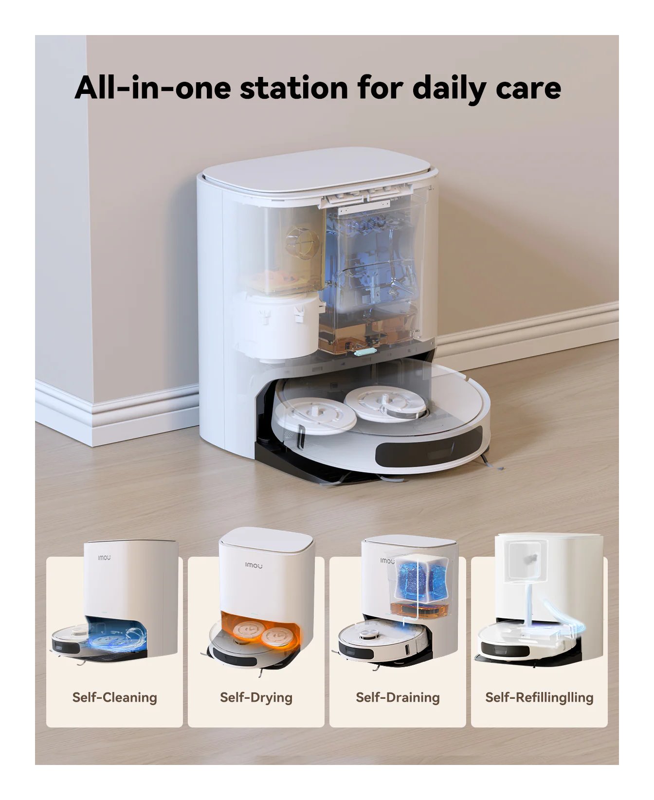 Robot aspirapolvere completamente automatio 5in1. Imou RV3 Robot aspirapolvere con funzione di pulizia a mocio. La stazione di aspirazione è autosvuotante, auto-lavante, auto-asciugante, auto-pulente e auto-riempiente. L'Imou RV3 pulisce contemporaneamente il suo mocio e il suo lavaggio con acqua calda a 55 °C per rimuovere macchie e odori sgradevoli.