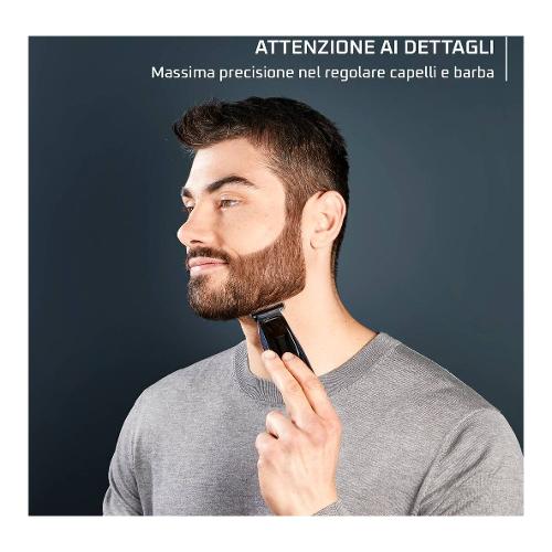 Rivoluziona la cura del tuo look con il nostro regolabarba di precisione d'ispirazione barber. La lama a T, ispirata ai barbieri, e i pettini da 1 a 5 mm garantiscono contorni precisi e una cura di barba e capelli da vero professionista. Con lame autoaffilanti in carbonio effetto diamante e un motore professionale, questo rasoio di precisione offre fino a 90 minuti di utilizzo senza filo, ideali per più sessioni.