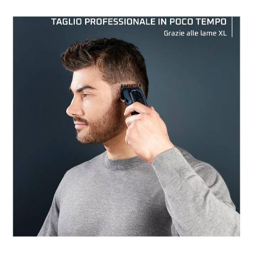Migliora la tua routine con il tagliacapelli Barber Experience. Dotato di una lama XL ispirata ai rasoi da barbiere, taglia masse consistenti di capelli in una sola passata, mentre i pettini fissi e il set per la sfumatura assicurano uno styling facile e impeccabile. Con lame autoaffilanti in carbonio e motore di livello professionale, questo tagliacapelli da uomo offre fino a 2 ore e 30 minuti di utilizzo senza filo, per molteplici tagli da casa.