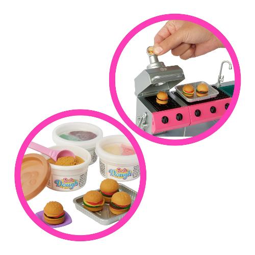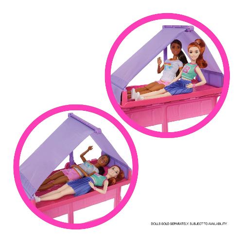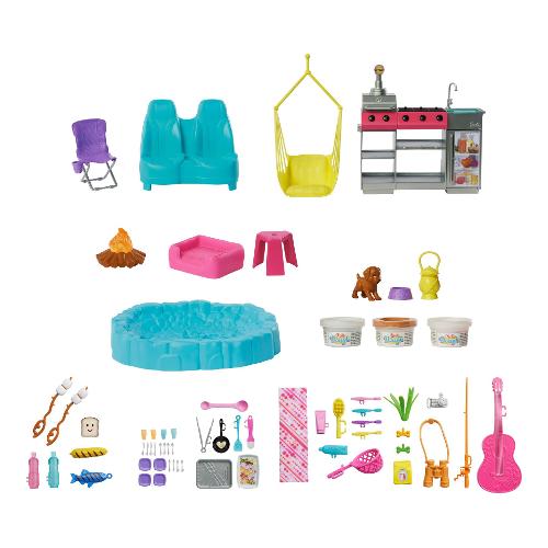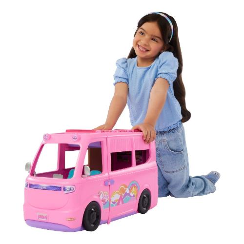 L'avventura ti aspetta con il playset Barbie Camper dei Sogni, che offre sette aree di gioco e più di 60 accessori per vivere avventure all'aria aperta! Spingi il camper per entrare nel gioco, poi aprilo per scoprire una tenda sul tetto a comparsa, un salotto, una zona pranzo e un bagno. Il divertimento è assicurato: pesca nel laghetto, rilassati sull'altalena e prepara lo spazio per l'adorabile cucciolo. Quando è ora di cena, usa la pasta modellabile inclusa per preparare hamburger per Barbie e i suoi amici (in vendita separatamente) o divertiti a grigliare con il barbecue: guarda il cibo che si trasforma mentre 'cuoce' con un'azione cambia colore!