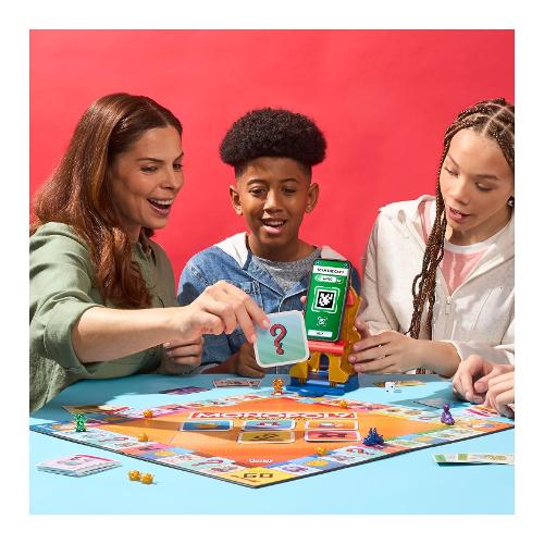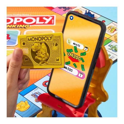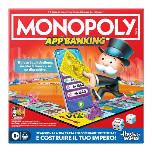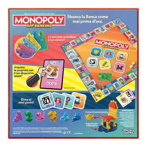 Il gioco Monopoly App Banking è il primo Monopoly dotato di app per una gestione semplice della Banca, mini giochi e molto altro! In questo gioco da tavolo facile per bambini e bambine, i giocatori hanno le classiche regole di Monopoly sul tabellone, ma l'app fa la Banca. No contanti o conti! Per iniziare a giocare, scarica l'app Monopoly App Banking (download gratuito; possono applicarsi tariffe dati e acquisti in-app) e posiziona il dispositivo smart sul supporto incluso (dispositivo non incluso). Scegli una carta di credito e la pedina corrispondente e inizia a giocare sul tabellone pieno di proprietà fantasiose. Scansiona i Contratti e acquista, metti all'asta e riscuoti l'affitto con l'app. I giocatori possono anche giocare ai mini giochi per ottenere vantaggi! Con un ritmo di gioco più veloce rispetto al classico Monopoly, è perfetto per una partita quotidiana e per le serate di gioco in famiglia. I giochi tramite app e i giochi per la famiglia sono regali fantastici per bambini e bambine dagli 8 anni in su che amano Monopoly Super Electronic Banking e altri giochi Monopoly.