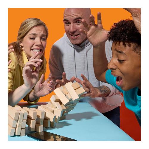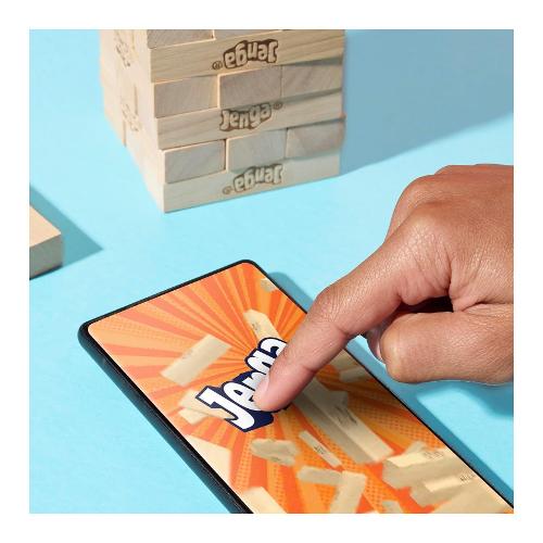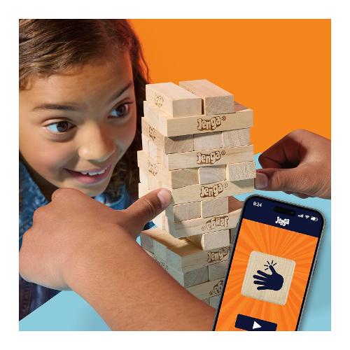 In questa versione di Jenga, divertiti con la modalità di gioco classica o prova a giocare con il dado digitale! I giocatori estraggono un mattoncino dalla pila e cercano di aggiungerlo in cima senza far cadere la torre. Il dado rende il gioco ancora più emozionante con 6 sfide da cardiopalma: batti il tempo, impila 2 mattoncini diversi, decidi quale avversario deve prendere il tuo turno, usa solo i pollici, fai squadra o posiziona il mattoncino ovunque tranne che nella fila in cima. Più mattoncini Jenga vengono estratti, più la torre diventa instabile, finché non crolla! Questo gioco in legno è dotato di una sagoma per impilare i mattoncini, per prepararli e riporli con facilità. È un'ottima scelta per chi è alla ricerca di giochi per famiglie o per le serate di giochi di gruppo. Inoltre, i giochi di società per bambini e bambine e i giochi da tavolo sono regali divertenti per le festività o le feste di compleanno per bambini e bambine