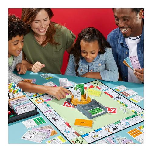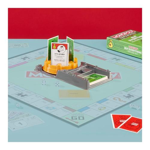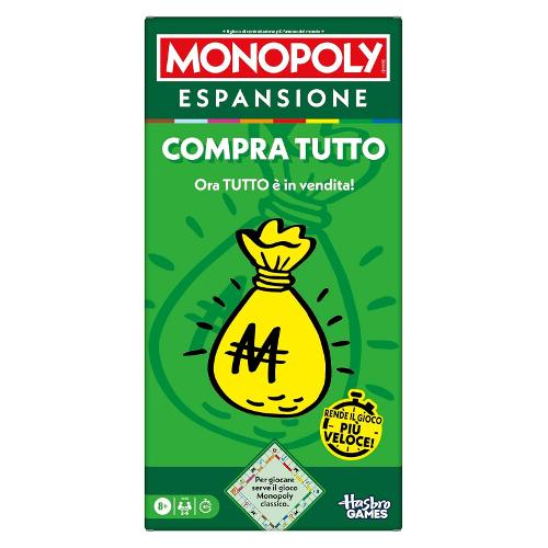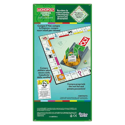 il classico gioco Monopoly più emozionante e veloce con l'espansione compra tutto! Questa è un'espansione, non un gioco indipendente (per giocare serve il gioco monopoly classico, venduto separatamente). Acquista abilità speciali dalla cassaforte delle vendite: la cassaforte delle vendite offre diverse carte in grado di influenzare il gioco. Per acquistarne una, i giocatori devono lanciare il dado compra. Alcune carte vendita conferiscono un vantaggio. Contiene: 1 Cassaforte delle vendite rotante con base, 1 dado Compra con adesivi, 20 carte Vendita, 8 contratti, 4 carte promemoria e guida all'espansione.