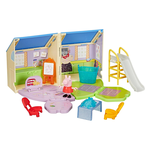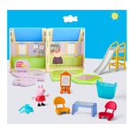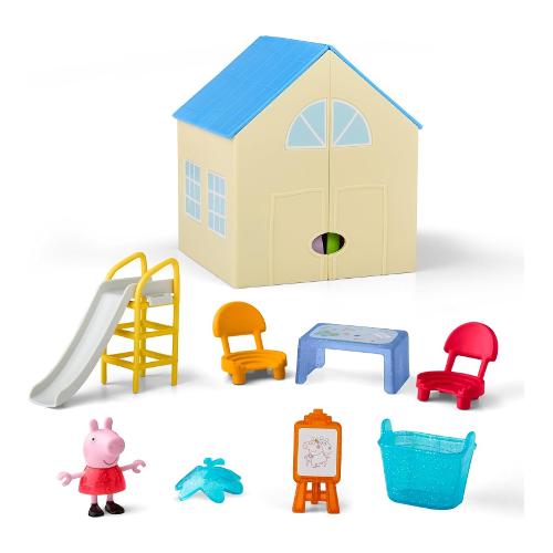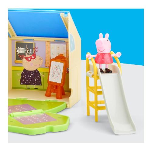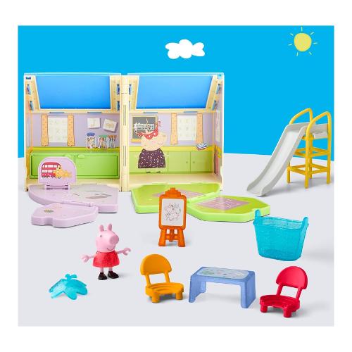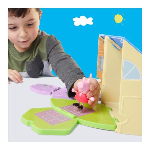 Il playset "Peppa's Pop-Open Playgroup" è pronto per ogni tipo di storia prescolare! I bambini possono aprire e ripiegare la scuola per rivelare l'aula e l'area giochi, quindi disporre gli accessori a loro piacimento. È ora di disegnare? Immagina Peppa Pig che usa il cavalletto o che è seduta su una sedia al tavolo da disegno. Cosa ha creato Peppa? Una maschera da farfalla scintillante! Peppa può davvero indossare la maschera, così i bambini possono ricreare i loro momenti preferiti del cartone animato. È ora di ricreazione! Giochiamo a campana o scendiamo dallo scivolo? (Facciamo entrambe le cose!) Con così tanto gioco di finzione, questo set di giocattoli di Peppa Pig entusiasmerà tutti i fan di Peppa che amano i personaggi e i playset di Peppa Pig