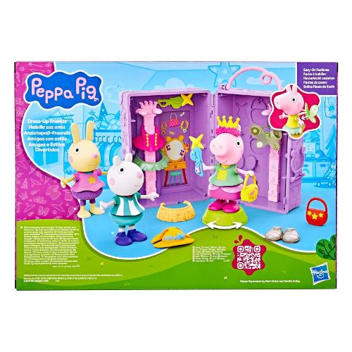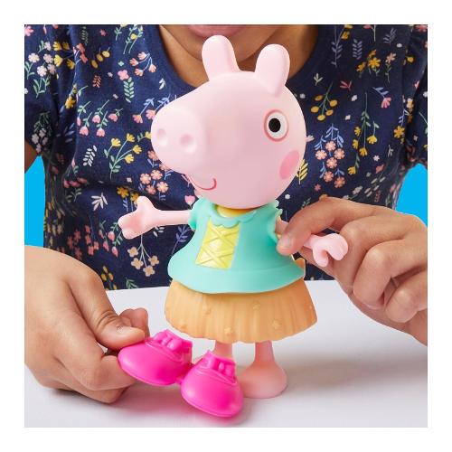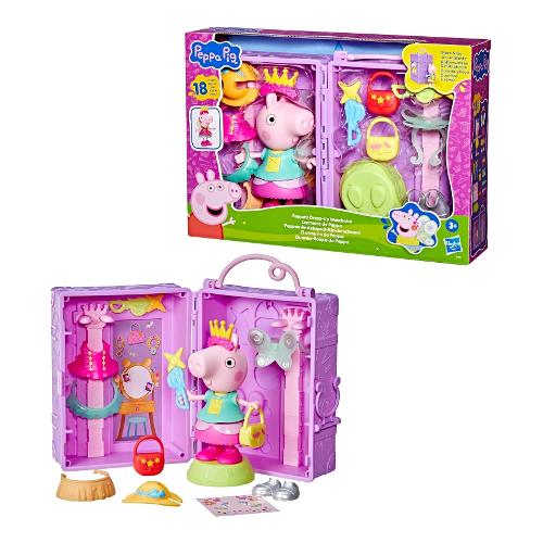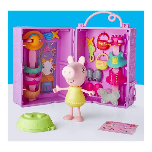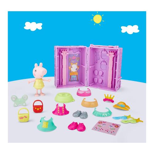 Infinite fantastiche possibilità con il guardaroba di Peppa! Questo set da gioco di Peppa Pig include una bambola di Peppa Pig da 15 cm da vestire, 14 accessori fashion facili da indossare, sticker, un supporto girevole per la bambola e una custodia per tenere tutto in ordine! Le bambine e i bambini possono creare moltissimi outfit diversi: un outfit da principessa fata con le ali, una corona e un tutù; un outfit da festa in giardino con una maglia svolazzante, una gonna a fiori e una borsa con una farfalla; un outfit da fata dei fiori con un cappello da mare, una bacchetta e delle scarpe rosa. Infine, con gli sticker si può personalizzare ulteriormente ogni look. Mostra le tue combinazioni preferite con il supporto girevole e poi metti in ordine per la prossima sessione di gioco con la custodia guardaroba. I giocattoli di Peppa Pig come il guardaroba di Peppa sono un regalo perfetto per bambine e bambini dai 3 anni in su che amano i giochi di fantasia e le bambole di Peppa Pig. Aumenta le possibilità di gioco con gli amici da vestire di Peppa Pig (venduti separatamente, secondo disponibilità).