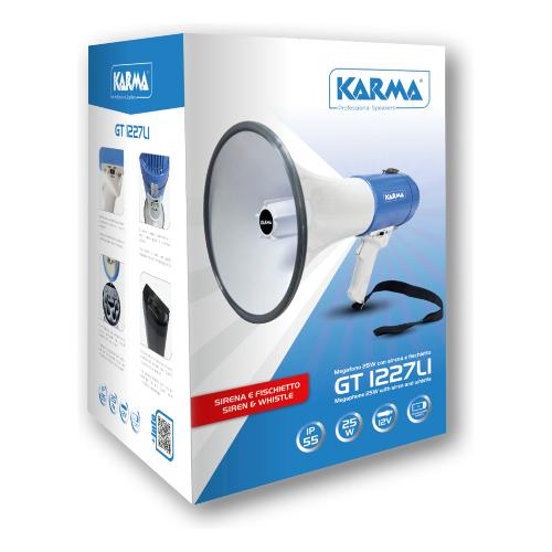 Robusto e maneggevole, ideato per operatori dello sport, guide turistiche, addetti ad operazione di emergenza o di soccorso. E’ costruito in materiale antiurto e dispone di protezione sulla tromba esponenziale. Monta un potente amplificatore da 25 Watt. Il volume regolabile con apposito comando consente propagazione fonica fino a 800 metri in normali condizioni ambientali. La sirena ed il fischietto inseribili a piacere rendono questo articolo indispensabile strumento per chi deve farsi ascoltare. Può essere alimentato da normali batterie alcaline (non incluse), oppure da una batteria ricaricabile al litio incorporata. Una presa 12V consente l'alimentazione esterna (ad esempio tramite accendisigari dell'auto).