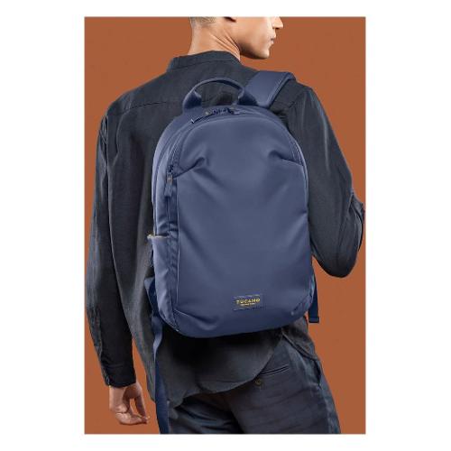 Zaino per laptop da 15.6" e MacBook Pro 16", realizzato in tessuto riciclato e resinato per garantire resistenza all'acqua. Questo zaino è dotato di un ampio vano centrale, una tasca frontale spaziosa e profonda, una tasca di sicurezza sul retro, oltre a tasche laterali con zip ideali per contenere bottiglie o ombrelli. Include anche una tasca interna dedicata per un localizzatore (non incluso), e una pratica fascia trolley sul retro per un facile trasporto su valigie