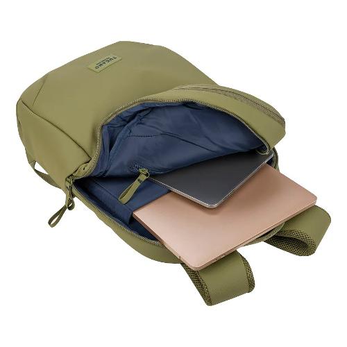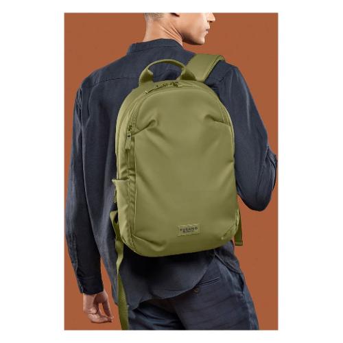Zaino per laptop da 15.6" e MacBook Pro 16", realizzato in tessuto riciclato e resinato per garantire resistenza all'acqua. Questo zaino è dotato di un ampio vano centrale, una tasca frontale spaziosa e profonda, una tasca di sicurezza sul retro, oltre a tasche laterali con zip ideali per contenere bottiglie o ombrelli. Include anche una tasca interna dedicata per un localizzatore (non incluso), e una pratica fascia trolley sul retro per un facile trasporto su valigie