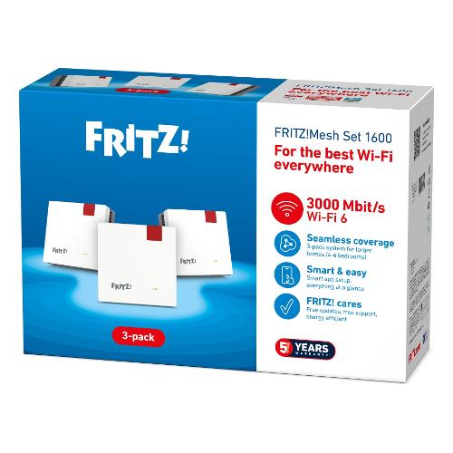Il set Wi-Fi AVM FRITZ!Mesh 1600 da 3 pezzi offre velocità Wi-Fi 6 veloci e affidabili fino a 3000 Mbps , ideali per streaming, gaming o lavoro da casa senza interruzioni. Con tre potenti FRITZ!Repeater 1200 AX inclusi nel set, avrai una copertura Wi-Fi impeccabile e connessioni stabili ovunque, in ogni stanza e su ogni piano.