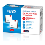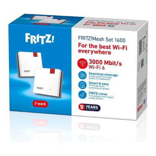 Il set Wi-Fi AVM FRITZ!Mesh 1600 da 2 pezzi offre velocità Wi-Fi 6 veloci e affidabili fino a 3000 Mbps , ideali per streaming, gaming o lavoro da casa senza interruzioni. Con due potenti FRITZ!Repeater 1200 AX inclusi nel set, avrai una copertura Wi-Fi impeccabile e connessioni stabili ovunque, in ogni stanza e su ogni piano.