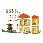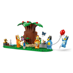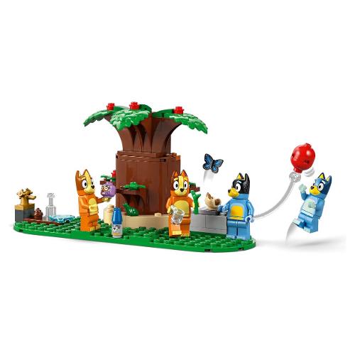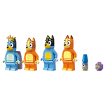 La casetta modulare a più stanze contiene 4 minifigure – Bluey, Bingo, Chilli (la mamma di Bluey) e Bandit (il papà di Bluey) – e accessori, tra cui un mantello arcobaleno, una bacchetta e lenti di ingrandimento. Tutte le stanze sono staccabili e permettono di giocare in molti modi. All’interno della stanza dei giochi si trovano una casa delle bambole, un pianoforte e una bancarella di cibi finti. La cucina è dotata di frigorifero, forno, fornelli, tavolo e sedie. Al piano superiore si trovano la camera da letto di mamma e papà e il bagno. La camera da letto in soffitta di Bluey e Bingo ha un tappeto, una lampada e la figura di Chiacchierotto. Accanto c’è il trono della Regina, completo di teiera, tazza e rana. Nel giardino ci sono un grandealbero, un hot dog, una pizza, il rubinetto dell’acqua, lo gnomo Jeremy e un pallone con cui giocare.