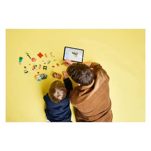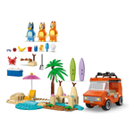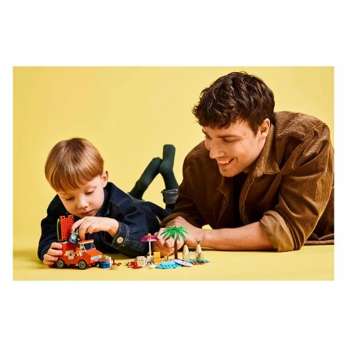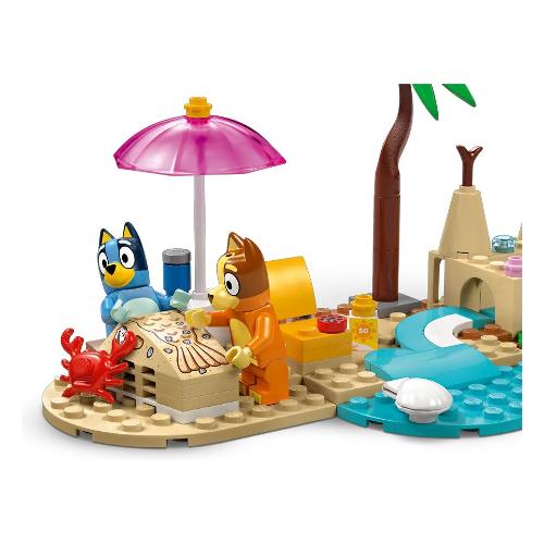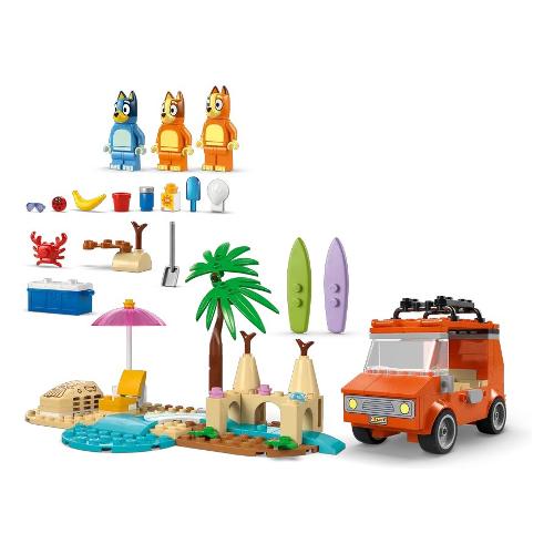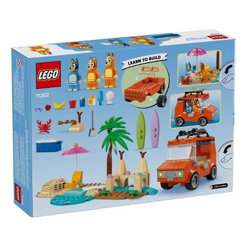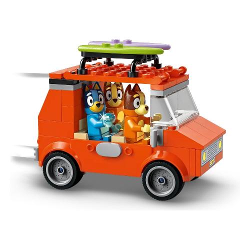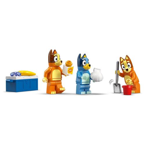 Questo giocattolo LEGO® contiene l’iconico veicolo dello show Bluey, con 2 tavole da surf sul tetto e un bagagliaio sul retro in cui riporre la borsa frigo. Il tetto apribile dell’auto consente ai bambini di accedere facilmente all’interno, dove si trovano i sedili per le minifigure di Bluey, Bingo e Chilli (la mamma di Bluey). Le caratteristiche della spiaggia che ispirano il gioco d’immaginazione includono un imponente castello di sabbia, una coda di sirena di sabbia in cui può essere posizionata una minifigure, una sedia reclinabile, un ombrellone e una palma. Gli accessori includono un granchio, un gelato, occhiali da sole e crema solare.