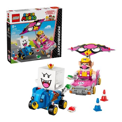 Gareggia, derapa, plana e combatti con questo set Mario kart™ – Wario e Re Boo LEGO® Super Mario™ (72038). Un’entusiasmante idea regalo a tema Nintendo® per i bambini, le bambine e tutti i gamer dagli 8 anni in su, il set comprende 2 figure LEGO Super Mario, modelli in mattoncini degli iconici veicoli Discocabrio e Quad orsetto, oltre a 2 coni stradali. Ogni kart ha una funzione di lancio di gusci e un’azione di derapata, mentre il Discocabrio ha un aliante staccabile montabile anche sul Quad orsetto. Posiziona un personaggio LEGO® Mario™, LEGO® Luigi™ o LEGO® Peach™ (dai set 71439, 71440, 71441 o 72043 – disponibili separatamente) in uno dei kart per il gioco interattivo, attivando gli effetti sonori/visivi di Mario Kart, come il clacson, la derapata e la planata. Trova le istruzioni per la costruzione di questo set LEGO Nintendo nella confezione o nell’app LEGO Super Mario e cerca altri set Mario Kart LEGO Super Mario (disponibili separatamente) per altri personaggi e veicoli con cui gareggiare e combattere.