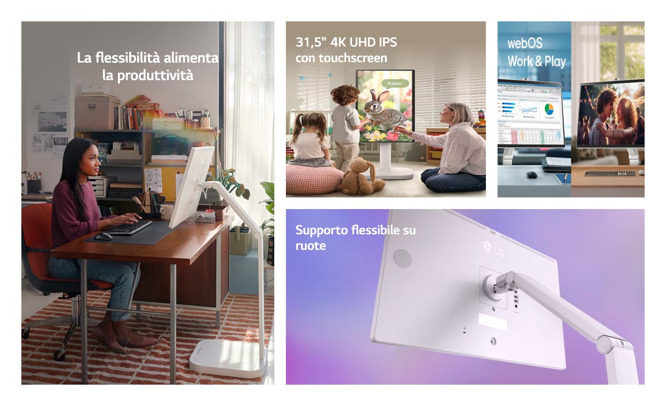 Scopri la straordinaria flessibilità del monitor LG Smart con touchscreen, dotato di supporto girevole per una regolazione ottimale in diverse angolazioni e posizioni. Goditi un controllo touchscreen fluido, un ampio display da 31,5 pollici e una straordinaria qualità delle immagini 4K per il lavoro e l'intrattenimento.