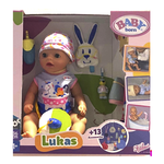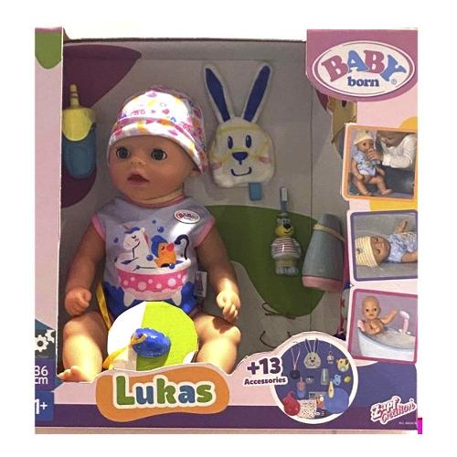 Bambola Baby Born con 6 funzioni: beve acqua, bagna il pannolino, va sul vasino, può essere lavato, è super-mobile, dorme . Comprende 14 accessori: certificato di nascita, biberon, ciuccio, pannolino in tessuto riutilizzabile, vasino + sapone, panno, contenitore per dentifricio, bicchiere, contenitore per polvere, spazzolino da denti, barattolo di crema, annaffiatoio e adesivi