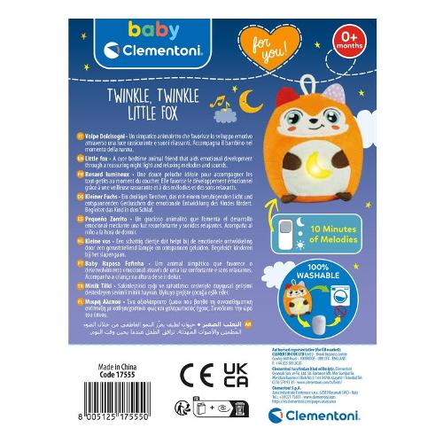 Questa soffice volpe è una luce notturna e un peluche per facilitare il rilassamento e l'accompagnamento al sonno. come tutti i personaggi della linea Twinkle Twinkle si illumina attivando melodie rilassanti e suoni bianchi studiati per facilitare l'addormentamento del bambino. La luce calda aiuta ad allietare l'ambiente intorno al bambino, mentre suoni e melodie incoraggiano il rilassamento. Gioco adatto a neonati a partire dagli 0 mesi, ma anche per bambini di 6 mesi o più nella fase di transizione all'addormentamento autonomo. Lavabile in lavatrice estraendo il modulo elettronico. Ideato, progettato e sviluppato in Italia.