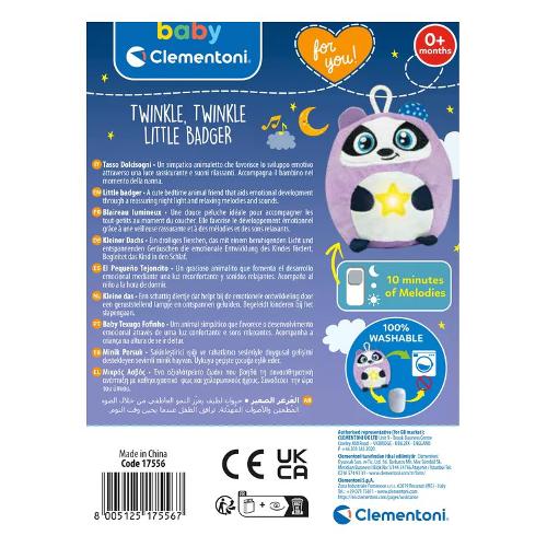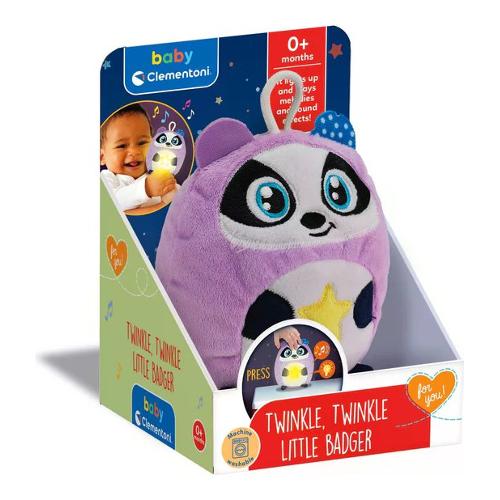 Questa piccolo tasso è una luce notturna e un peluche per facilitare il rilassamento e l'accompagnamento al sonno. come tutti i personaggi della linea Twinkle Twinkle si illumina attivando melodie rilassanti e suoni bianchi studiati per facilitare l'addormentamento del bambino. La luce calda aiuta ad allietare l'ambiente intorno al bambino, mentre suoni e melodie incoraggiano il rilassamento. Gioco adatto a neonati a partire dagli 0 mesi, ma anche per bambini di 6 mesi o più nella fase di transizione all'addormentamento autonomo. Lavabile in lavatrice estraendo il modulo elettronico. Ideato, progettato e sviluppato in Italia.