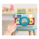 Una coloratissima macchina fotografica dal design ricercato e curato nei minimi dettagli, per ascoltare simpatiche canzoncine o divertenti versi di animali ad ogni scatto. Con pulsanti colorati che attivano suoni o canzoncine e che guidano il bambino in esperienze di gioco coinvolgenti e interattive attraverso stimoli sempre nuovi. Ai suoni, alle canzoncine e al flash che catturano l’attenzione del bambino si aggiungono piccole interazioni fisiche per sviluppare, oltre all’aspetto cognitivo, anche la motricità fine del piccolo. Ogni pulsante, attività e materiale impiegato è studiato per rendere facile e accogliente l’utilizzo del gioco da parte del bambino. Ogni volta che si preme il pulsante di scatto si attivano canzoncine, musiche ed effetti sonori, accompagnati dal lampeggiare della luce del flash ed una simpatica foto con effetto pop-up! L’obiettivo della macchina fotografica contiene un piccolo specchietto e delle biglie coloratissime per attrarre il piccolo in un gioco di prospettive e profondità. La cura del dettaglio, lo studio delle attività, la ricerca dei colori sono frutto di una competenza 100% italiana che garantisce la qualità e la sicurezza del prodotto.