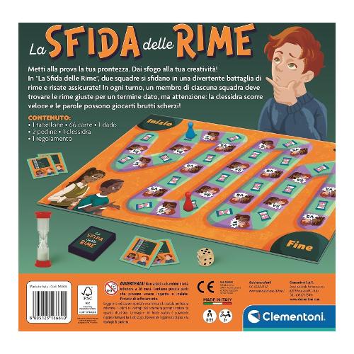 Un gioco avvincente per divertirsi con le rime. Sfida i tuoi amici e scopri chi è il più bravo a trovare le rime! Il gioco contiene tante carte, un tabellone e tutto il materiale per partite sempre diverse. Scopri l'intera offerta di giochi da tavolo clementoni. Made in italy