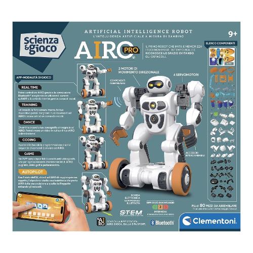 Un robot innovativo dotato di intelligenza artificiale che gli permette di riconoscere gesti e comandi vocali. Costruisci e personalizza il tuo robot addestrandolo a riconoscere tutti i gesti che desideri e divertiti con lui attraverso tante attività coinvolgenti. Prodotto innovativo arricchito con funzioni di intelligenza artificiale. Airo pro ha 6 motori che gli permettono di eseguire qualsiasi tipo di movimento e grazie ad un nuovo algoritmo di ai riesce a riconoscere oggetti nello spazio che lo circonda. Funzione di connessione bluetooth per interagire con l'app e giocare con tutte le modalità.