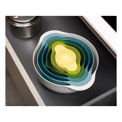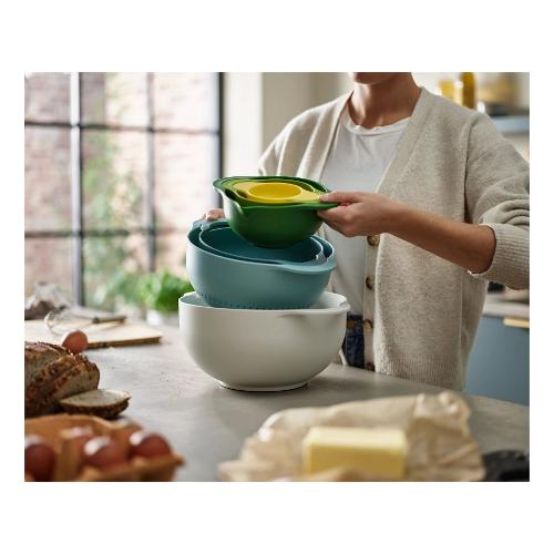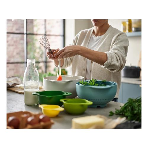 Il set preparazione cucina Joseph Joseph della serie Duo Editions è un kit versatile e salvaspazio, perfetto per ogni cucina. Con un design impilabile, questo set include : una scodella/bastardella per mescolare da 5000 ml, uno scolapasta da 3000 ml, un setaccio farina con rete a maglia fine da 1200 ml, una ciotola multiuso da 1000 ml e una ciotola per mescolare da 400 ml. I contenitori sono dotati di manici e tacche graduate interne per misurazioni precise. Realizzato in plastica senza BPA, è disponibile nei colori verde, azzurro e beige, ed è completamente lavabile in lavastoviglie per una pulizia facile. Ideale per chi cerca praticità, funzionalità e un tocco di colore nella propria cucina.
