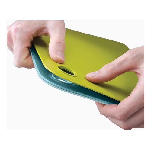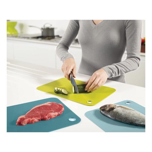 Il set di taglieri flessibili Joseph Joseph Duo è perfetto per una cucina pratica, igienica e ben organizzata. Realizzati in plastica senza BPA, offrono una superficie resistente e versatile per il taglio di diversi alimenti. Grazie al design flessibile, è possibile trasferire facilmente gli ingredienti direttamente in pentola, evitando sprechi e disordine. Ogni tagliere ha un colore differente per distinguere l'uso e ridurre il rischio di contaminazione incrociata: verde per la frutta, blu per il pesce e un terzo colore per altri alimenti. Il foro integrato permette di impilarli tra loro, garantendo una soluzione salvaspazio e un'archiviazione ordinata. Inoltre, sono lavabili in lavastoviglie, rendendo la pulizia rapida e semplice. Un set pratico ed essenziale per chi cerca efficienza, igiene e comodità nella preparazione dei pasti