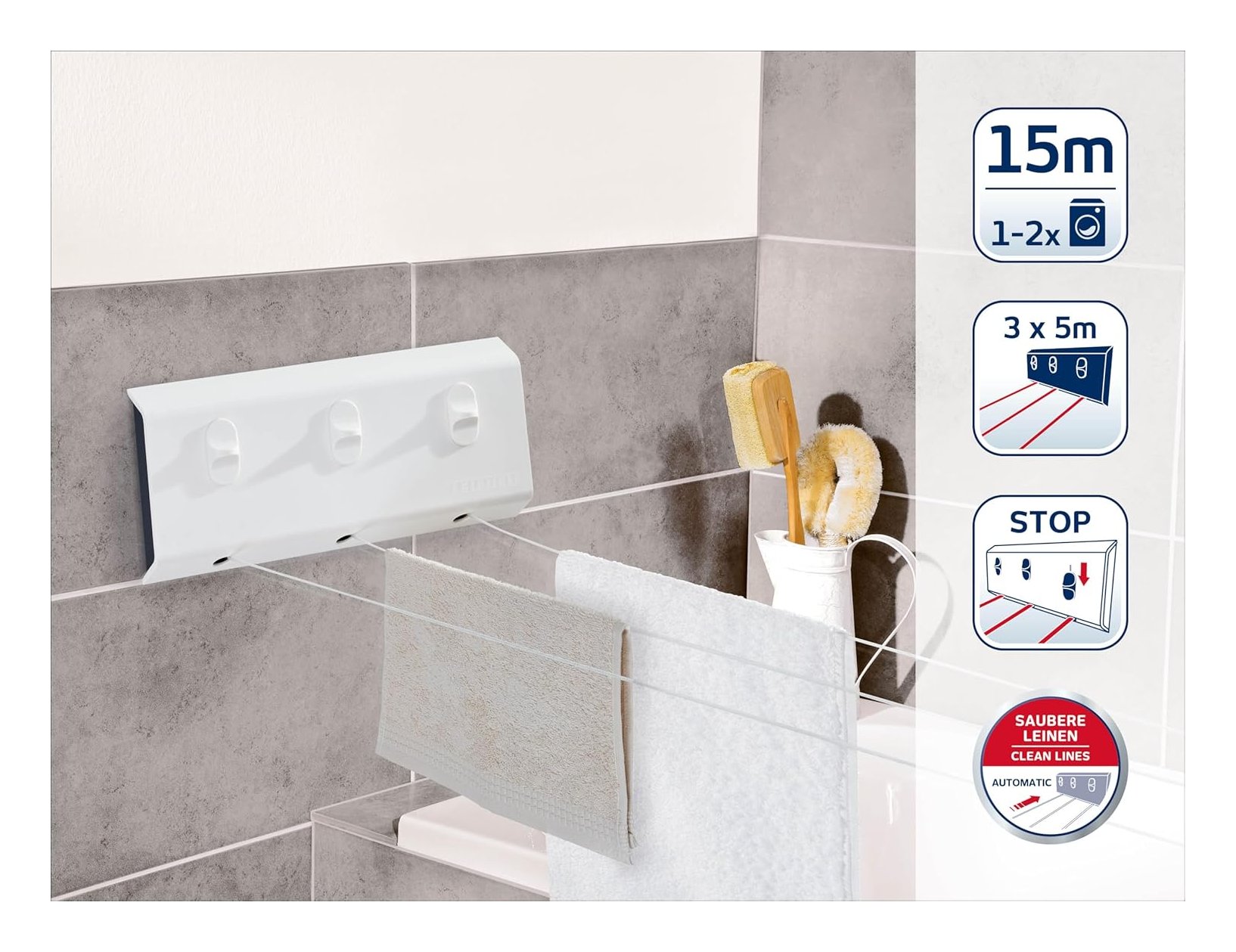 Stendibancheria da parete con avvolgimento automatico per biancheria e fili puliti. Lunghezza totale dei fili 15 m (tre volte 5 m) per un massimo di due carichi di lavatrice. Adatto per uso interno ed esterno grazie al materiale resistente alle intemperie. Fili in poliestere rivestiti in PVC facili da pulire La lunghezza dei fili può essere scelta liberamente in base alla larghezza del locale e allo spazio disponibile.