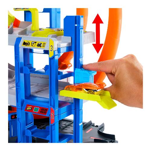 Il playset Hot Wheels City Mega Garage presenta tre livelli di gioco con macchinine a spinta per coinvolgere i giovani piloti in storie creative e acrobazie epiche. Il piano base di questo set multilivello consente ai bambini di guidare la macchinina attraverso un autolavaggio dotato di un rullo mobile e di una tenda. Inserisci la macchinina nel lanciatore e lanciala nel doppio loop; i deviatori la indirizzeranno verso il piano desiderato. Utilizza un ascensore azionato dai bambini o l'elicottero che trasporta le macchinine per trasportare i veicoli a qualsiasi livello e parcheggiarli. Amplia il gioco utilizzando i connettori Speed Snap Track. Include una macchinina Hot Wheels die-cast e un elicottero giocattolo. Veicoli e piste aggiuntive in vendita separatamente.