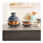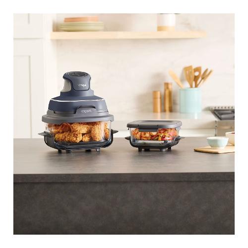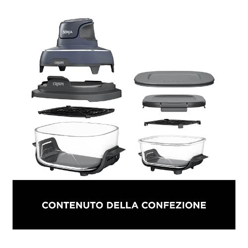 Tutta la potenza di una friggitrice ad aria di dimensioni normali in un sistema di cottura portatile. Superficie di cottura in vetro: cottura senza PFAS. 2 contenitori in vetro CleanCrisp lavabili in lavastoviglie (1,4 L e 3,8 L)