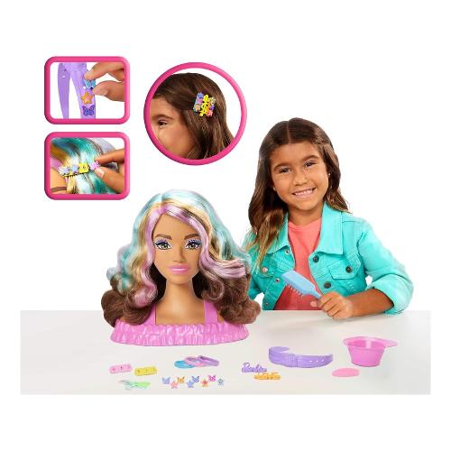 Prova nuove acconciature sui capelli di Barbie per ore e ore di divertimento! Le teste pettinabili Barbie stimolano la creatività e la sensibilità artistica di bambine e bambini