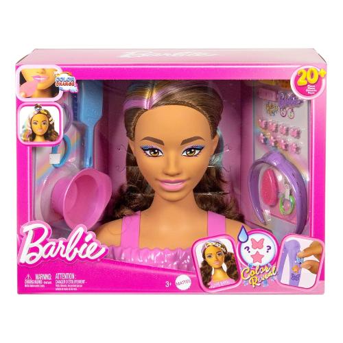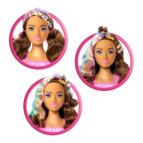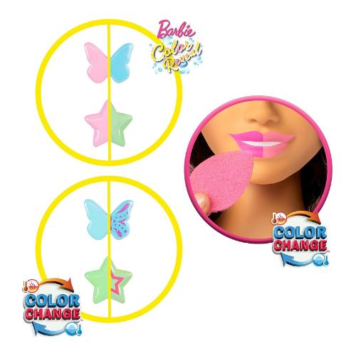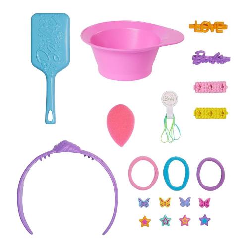 Ci sono così tanti modi per sistemare i colorati capelli di Barbie: utilizza la spazzola inclusa per raccoglierli in trecce, chignon, code molto altro ancora! Utilizza e prova gli accessori per capelli di Barbie. I bambini possono abbinare la propria acconciatura a quella Barbie utilizzando i fermagli, gli elastici o il cerchietto. Immergi i fermagli di Barbie in una ciotola piena d'acqua per vederli cambiare colore. Anche le labbra di Barbie possono cambiare colore: bagna la spugna per vedere la magia!