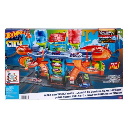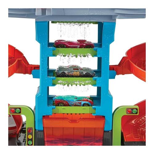 Entra nell'autolavaggio e ruota la maniglia per far salire la macchinina lungo la spirale rotante. Spruzza l'acqua fredda del serbatoio blu sulla macchinina Color Shifters in dotazione per cambiarne immediatamente l'aspetto. Poi, spruzza l'acqua calda del serbatoio rosso per trasformarla ancora. Metti altri 3 veicoli Color Shifters nei parcheggi centrali e modifica le decorazioni di 4 auto contemporaneamente! (Veicoli aggiuntivi in vendita separatamente).