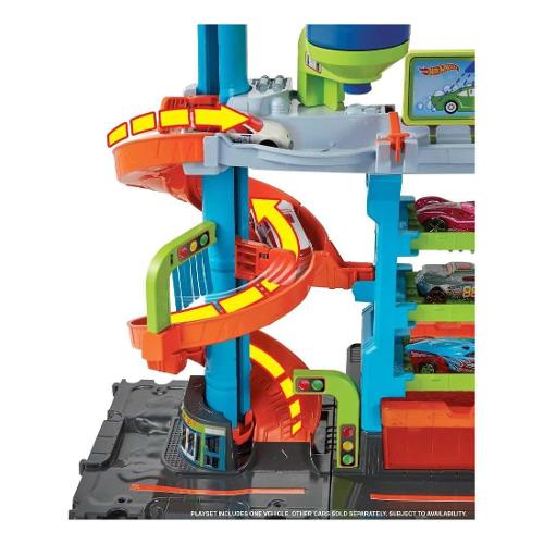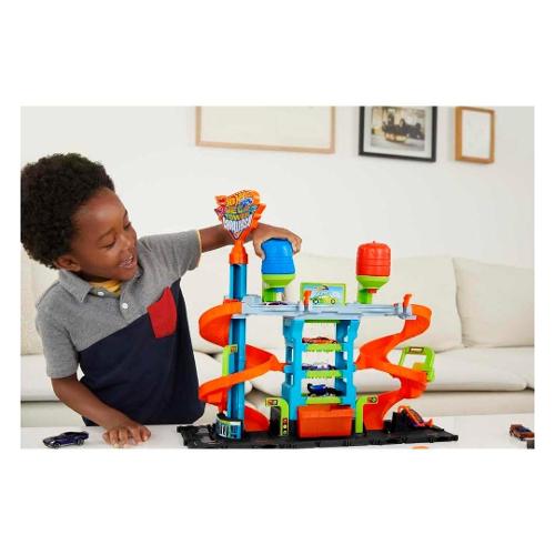 Il set è dotato di numerose funzioni di gioco che non richiedono acqua, come le sbarre mobili, il rullo in schiuma e la canna della benzina regolabile. I bambini possono collegarlo ad altri playset per costruire la propria Hot Wheels City.