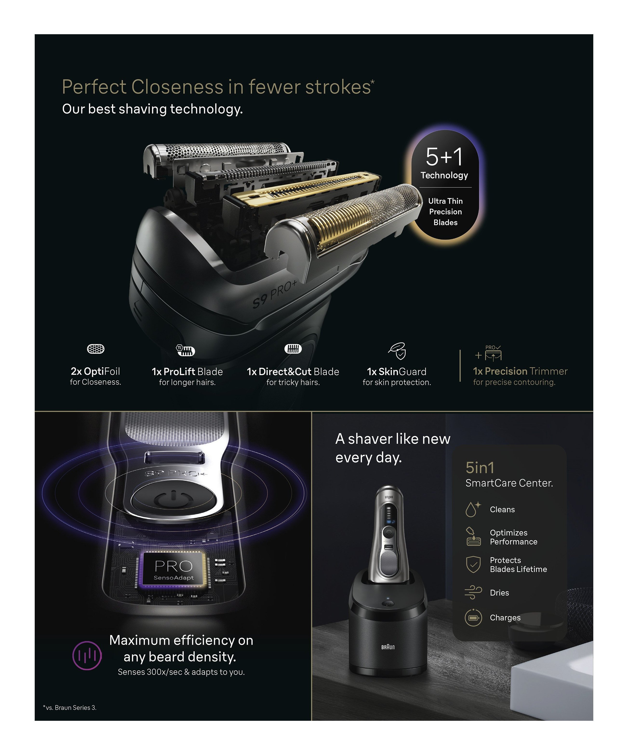 Il miglior rasoio elettrico barba Braun con 5+1 elementi di rasatura perfettamente sincronizzati per tagliare delicatamente le barbe più difficili ad ogni passata. La tecnologia Pro SensoAdapt con sensori ad alta precisione analizza la densità della barba 300 volte al secondo e adatta automaticamente la potenza di rasatura.