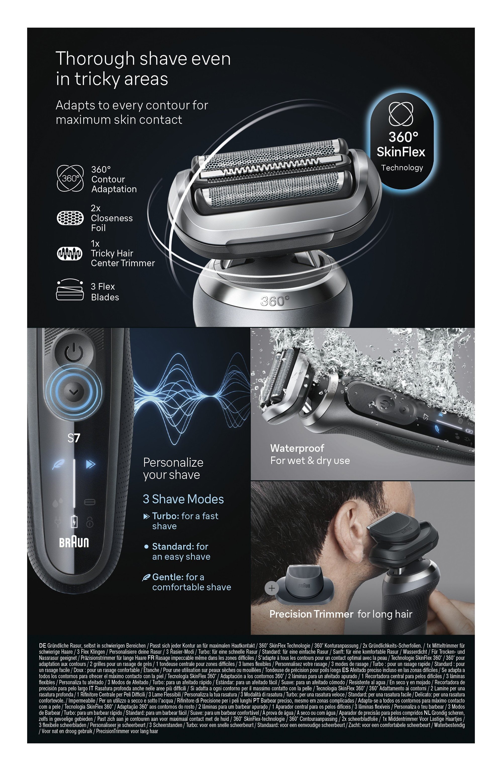 La testina 360° SkinFlex e le 3 lame flessibili si adattano ai tuoi contorni per una rasatura ultra liscia anche nelle aree difficili. Porta la tua routine di rasatura al livello successivo con la Stazione SmartCare 4in1 che pulisce il tuo rasoio barba elettrico 10 volte meglio dell'acqua