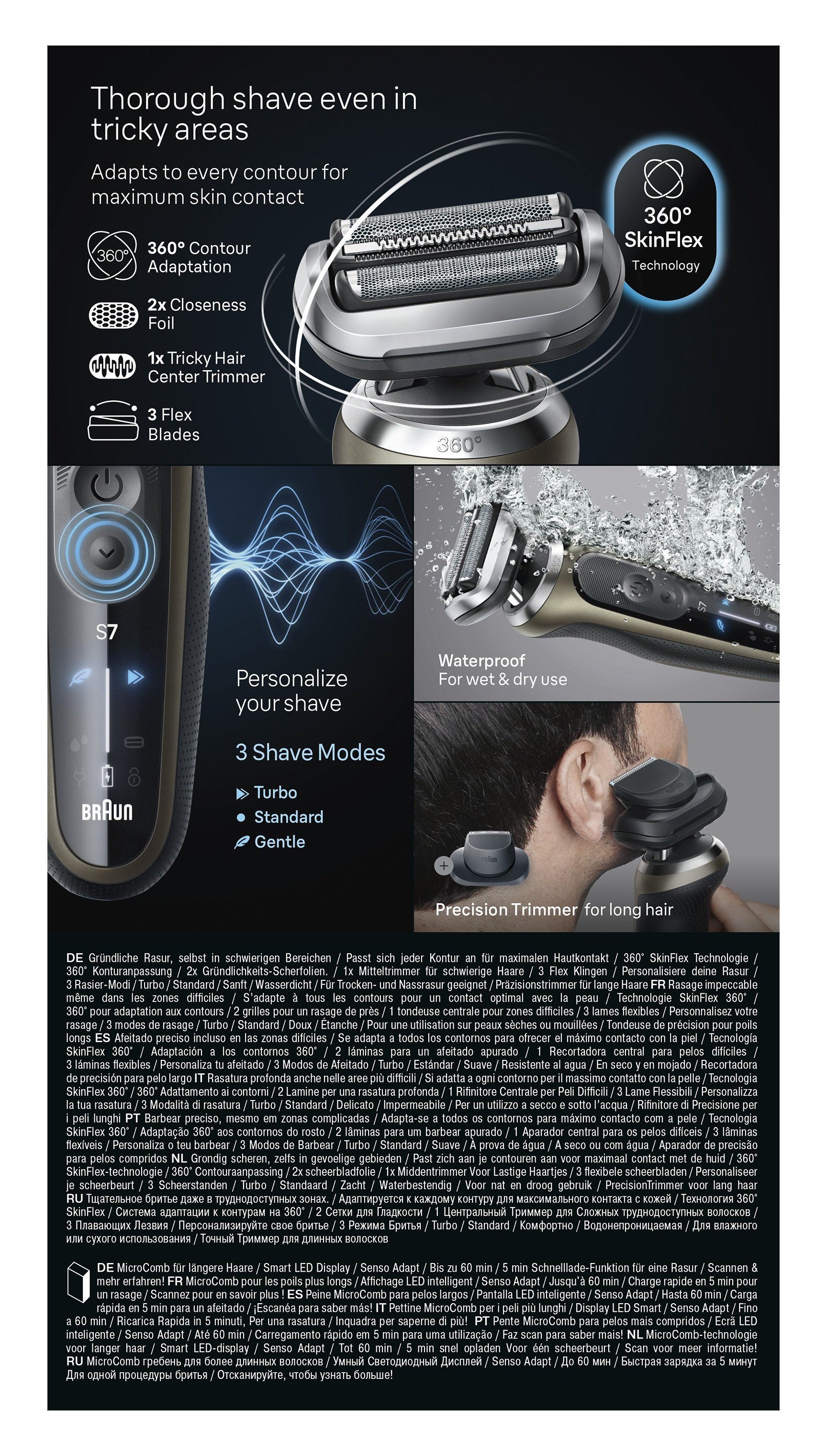 La testina 360° SkinFlex e le 3 lame flessibili si adattano ai tuoi contorni per una rasatura ultra liscia anche nelle aree difficili.