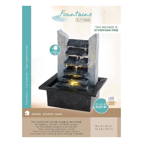 Fontana in polyresina con luce led adatta per l'uso interno ed esterno riparato. Alimentazione rete domestica con cavo 2 mt e trasformatore IP44