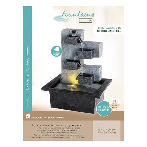 Fontana in polyresina con luce led adatta per l'uso interno ed esterno riparato. Alimentazione rete domestica con cavo 2 mt e trasformatore IP44
