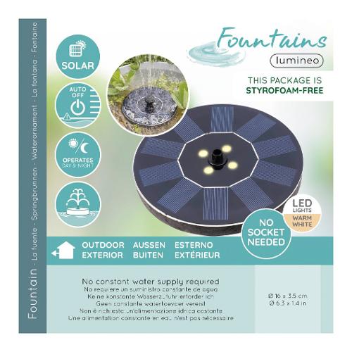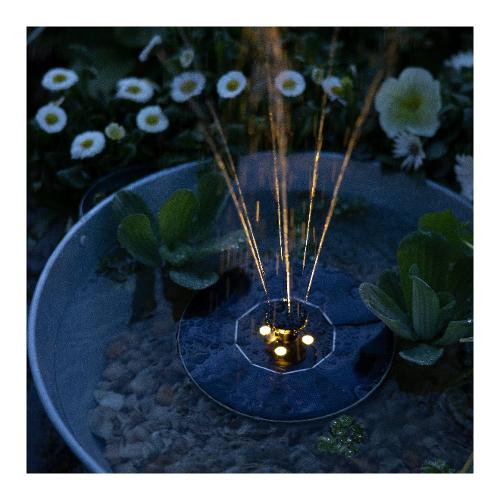 Funzionamento in appoggio, non necessita di collegamenti idraulici ed elettrici. Pompa 180 lt/min alimentazione batteria ricaricabile celle solari IP68, 4 led