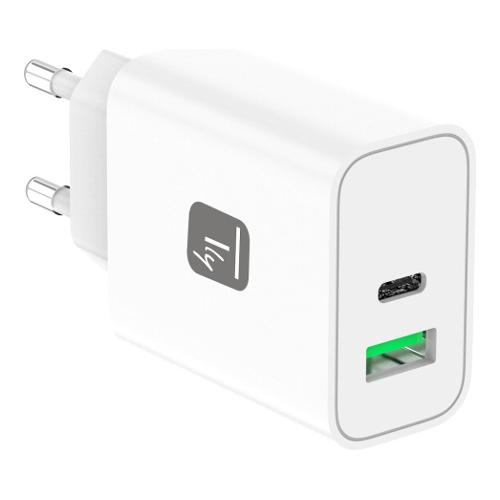 Caricabatterie GaN da viaggio ultracompatto e potente con una porta USB Type-C e una porta USB-A per la ricarica rapida di tutti i dispositivi compatibili.