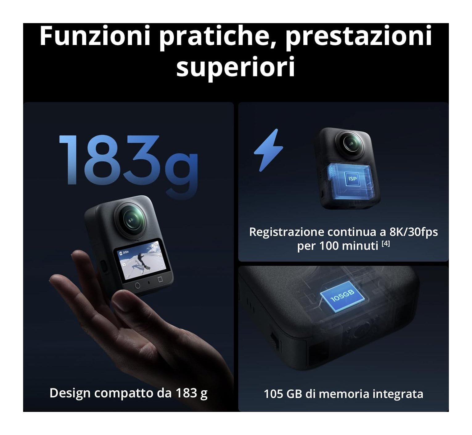 DJI Osmo 360 è la fotocamera ideale per creatori di contenuti, viaggiatori e videografi che desiderano catturare immagini e video a 360 gradi di alta qualità. Con la sua risoluzione 8K , la stabilizzazione avanzata e il design compatto , questa fotocamera è lo strumento perfetto per portare i tuoi contenuti a un livello superiore. Se stai cercando un dispositivo potente, facile da usare e portatile, Osmo 360 è un'ottima scelta.
