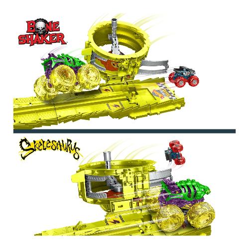 Uno Skelesaurus gigante e un Bone Shaker in scala 1:64 si affrontano in una gara per evitare la distruzione! Rilascia i due veicoli con la leva di attivazione e scopri se Bone Shaker riuscirà a sconfiggere il suo malvagio nemico mentre sfrecciano giù da una collina verso un enorme anello. La funzione casuale seleziona uno dei due finali seguenti: Bone Shaker riesce a passare attraverso l'anello e scappa in salvo mentre Skelesaurus viene lasciato nella polvere, o Skelesaurus cattura la sua preda, intrappolando Bone Shaker nell'anello e facendolo ribaltare. Il set include due auto schiacciate per una distruzione ancora maggiore.