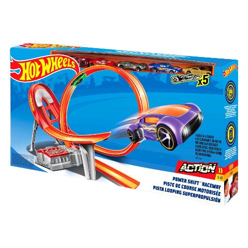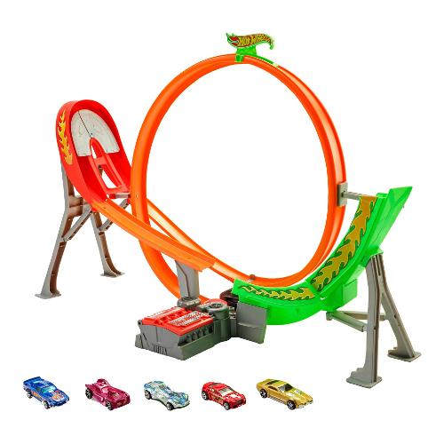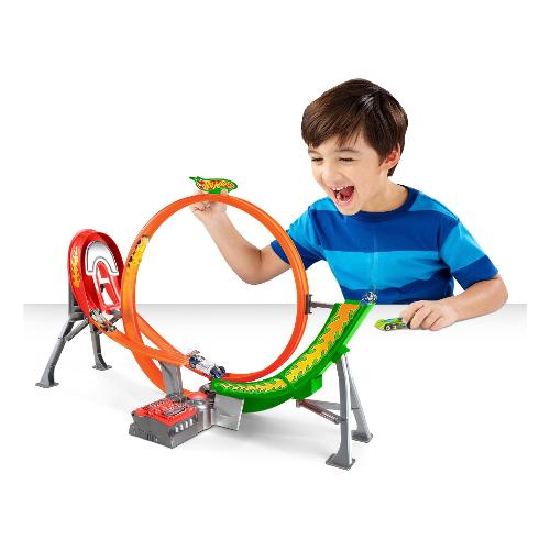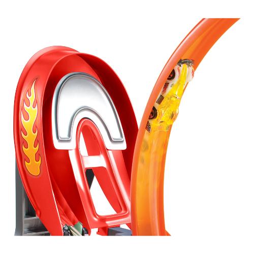 Compi azioni estreme su una pista rialzata in pendenza con curve angolate, loop esorbitante e spinta motorizzata, che offrono un'esperienza Hot Wheels® classica ma esagerata! I bambini possono far sfrecciare le loro macchinine su, giù e intorno a questa pista con loop motorizzato, per effettuare incredibili acrobazie ad alta quota con la rampa! In alternativa, possono far scendere in pista più macchinine per ore e ore di epiche gare e divertimento Hot Wheels®. Include un booster motorizzato per eseguire acrobazie e schianti a folle velocità, oltre A CINQUE veicoli Hot Wheels®!