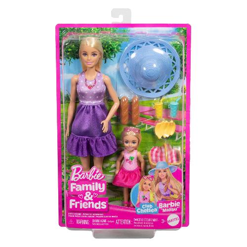 Con le bambole e i giocattoli Barbie Famiglia e Amici, i bambini possono inventare storie all'insegna del divertimento e dell'amicizia tra questa squadra affiatata! Barbie 'Malibu' e la sorellina Chelsea stanno andando a fare un picnic e i bambini hanno tutti gli accessori necessari per rivivere questo momento classico. Tra i nove pezzi a tema figurano accessori alla moda, un cestino, cibo, bevande e una tovaglia! I bambini possono collezionare altri giocattoli della linea Famiglia e Amici per creare tante altre storie divertenti. Le bambole non possono reggersi in piedi da sole.